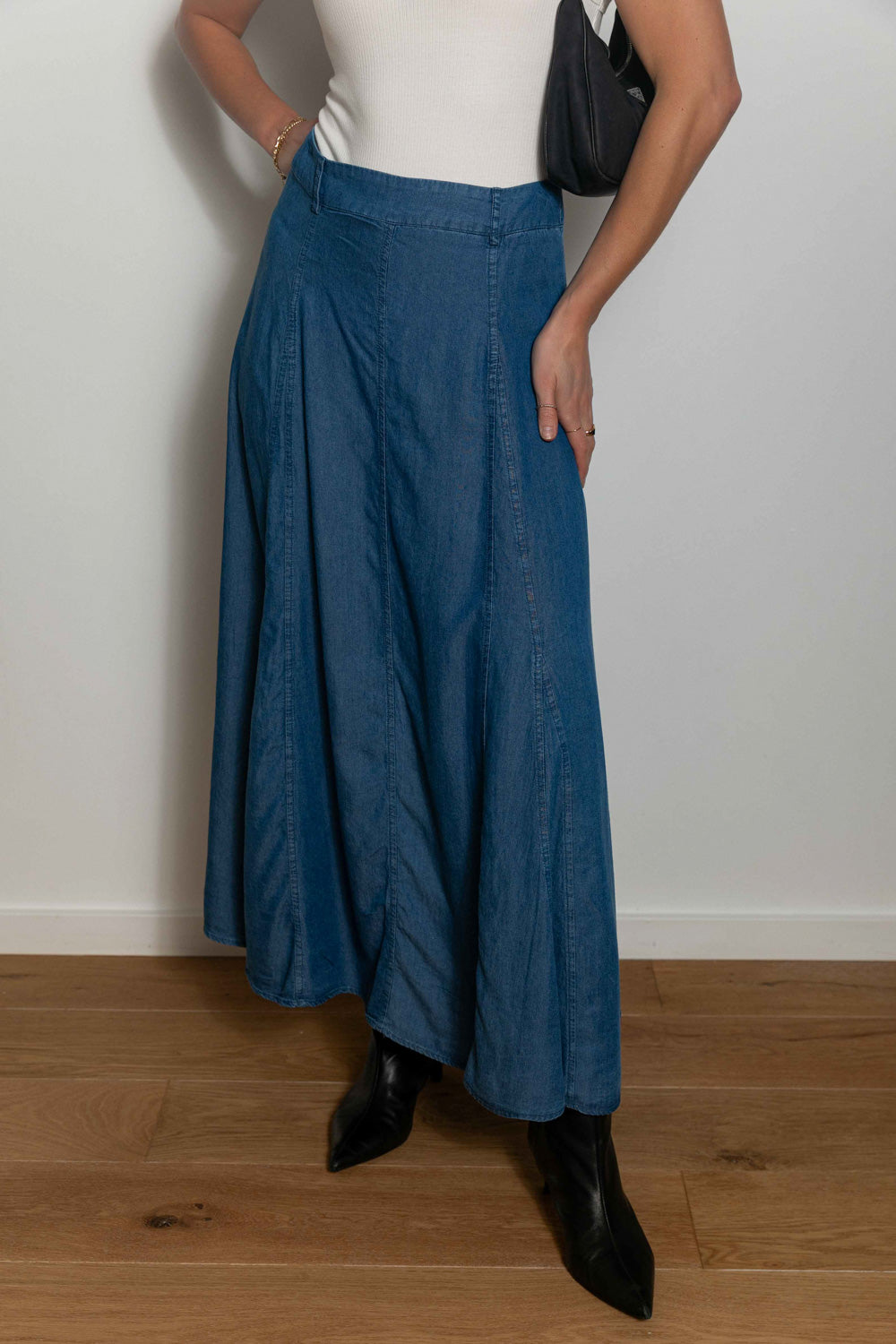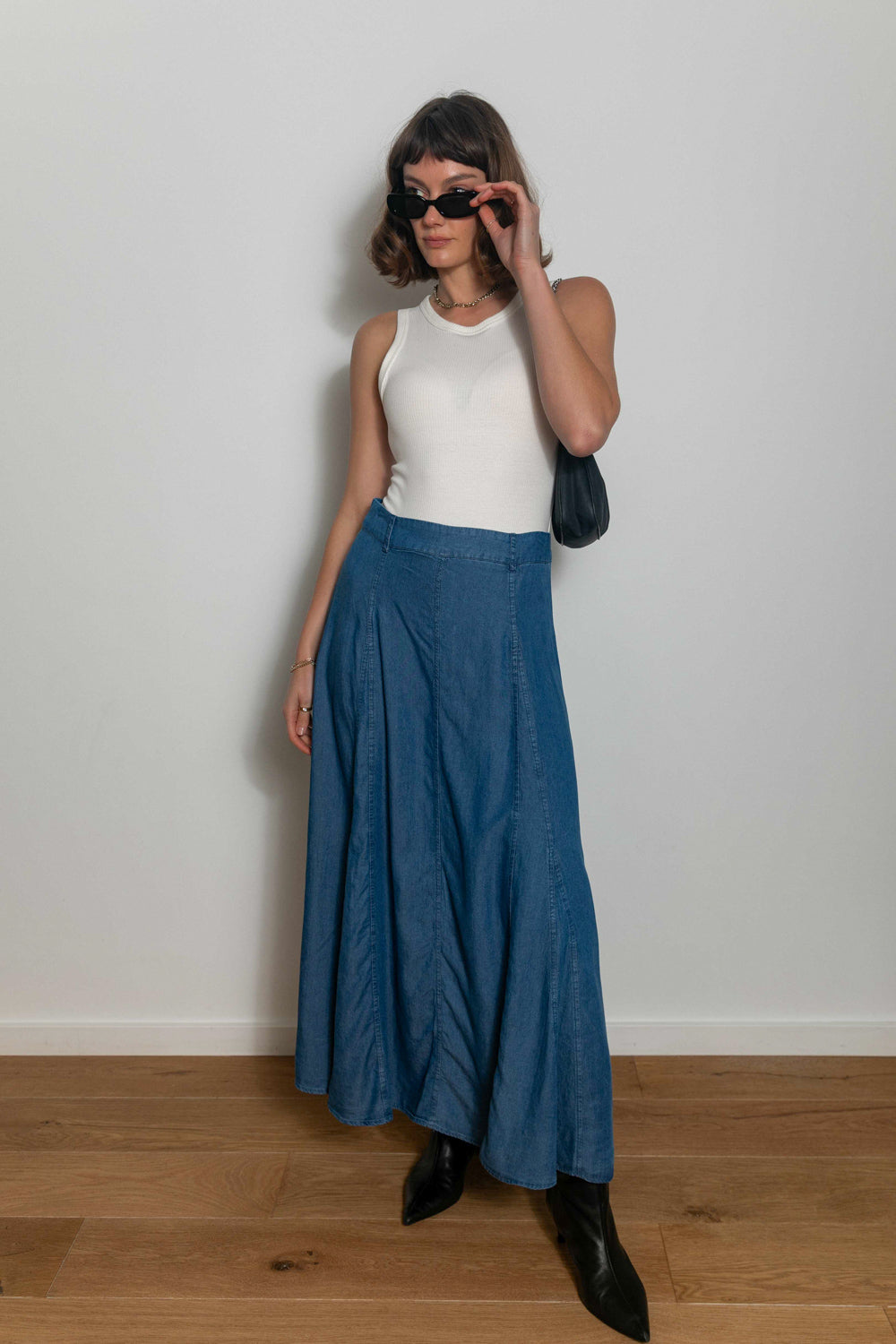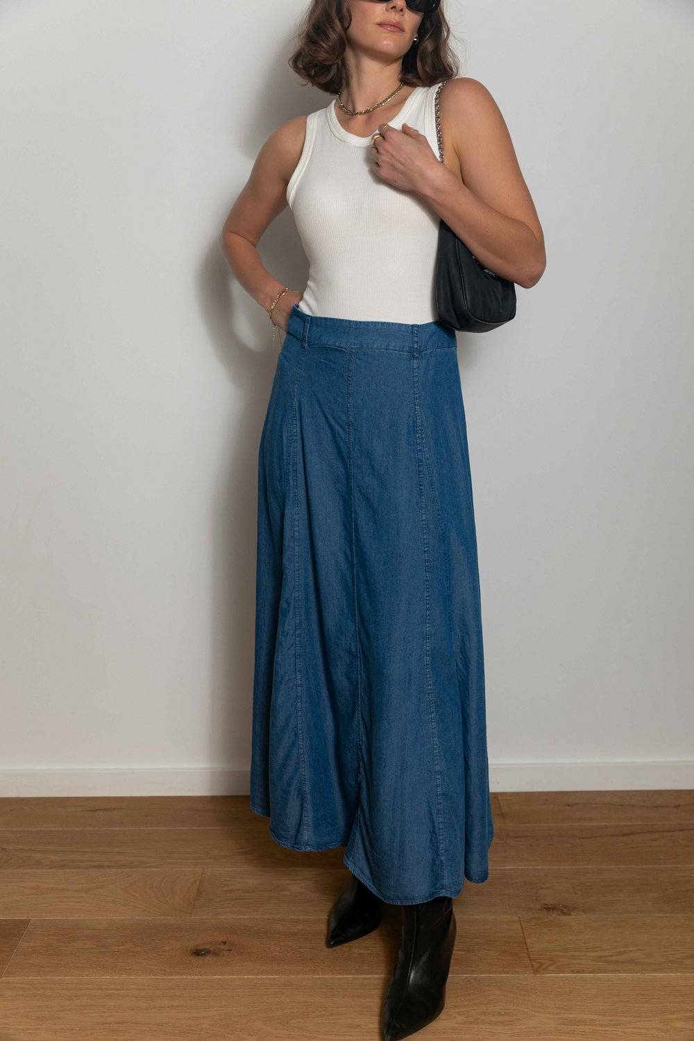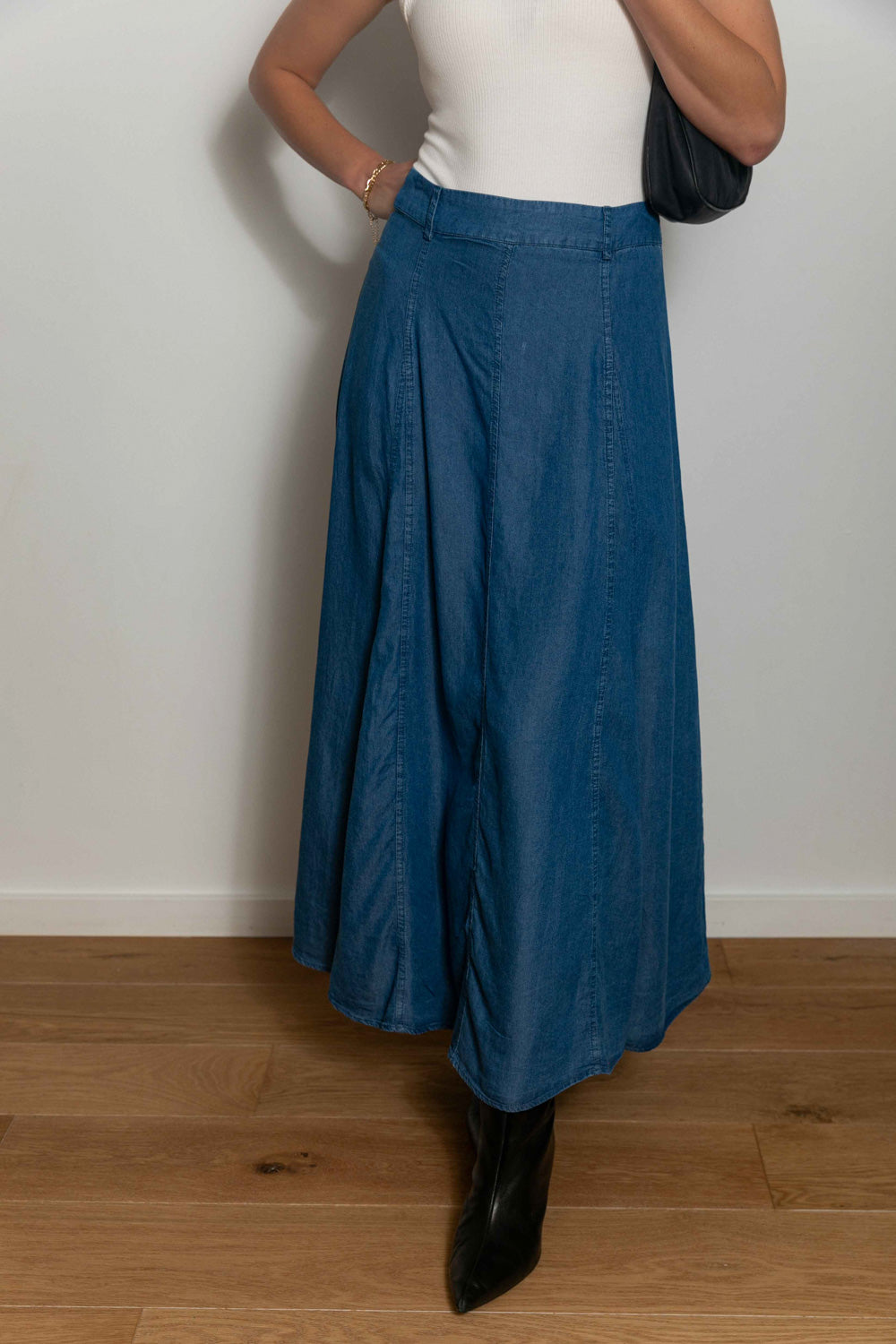 The Don’t Let Me Get Away Maxi Skirt is just as versatile as any pair of jeans! This skirt may look like regular denim, but it is lightweight, flowy, and perfect for any time of year! Pair it with a simple tee for a casual look, or with the Cropped in Lace Top to dress it up. We also love it with the Tell Me Tomorrow Sweater or the Take Me Out Tonight Top for a warm weather look.