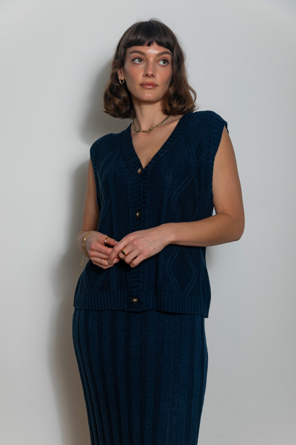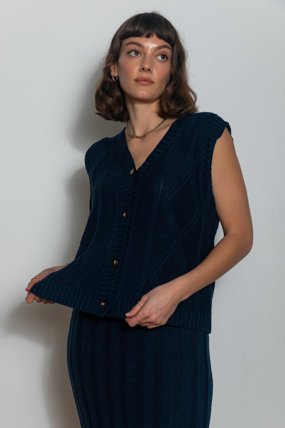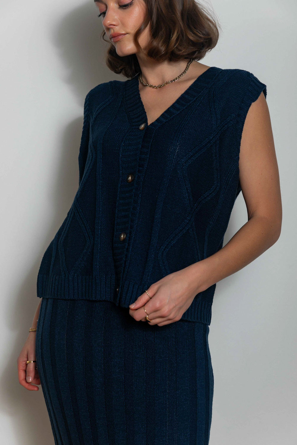 Model wearing size small in the Set on It Sweater Vest. Shelby is 5'7" with 33” Bust, 25” Waist and 36” Hips.